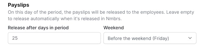 You choose the number of days after the start of the period. If you want to release the payslips on Saturday for weekly pay, you must submit 6 days after the start of the period. With a four-week period, we determine the first day of the period and then set the number of days after the start of the period. For the monthly salary, these are the calendar days after the start of the period. You also indicate what to do if the day falls on a weekend. Before the weekend, after the weekend or exact day.
